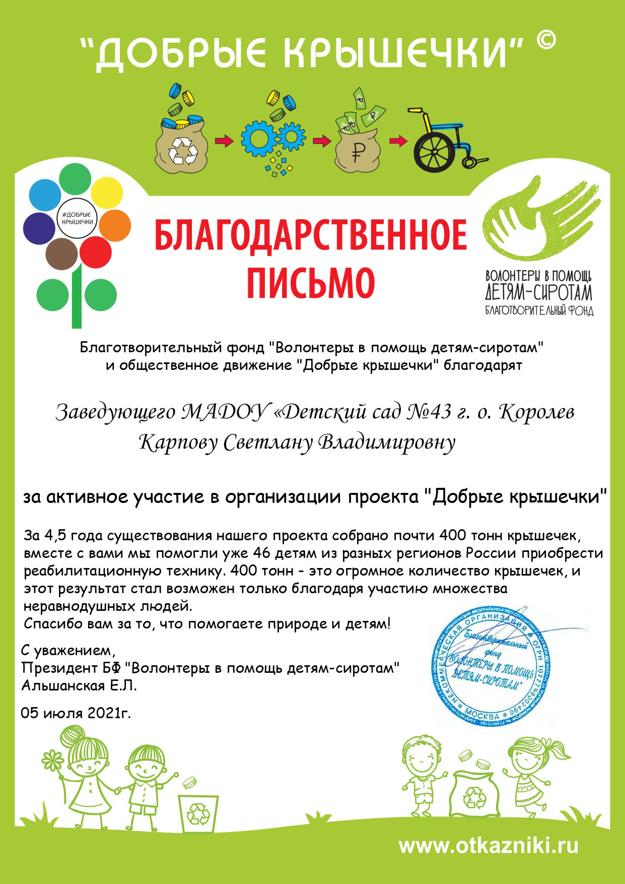 -Грамота Комитета образования и Администрации городского округа Королев Московской области за многолетний добросовестный труд по воспитанию и обучению детей дошкольного возраста, 2016